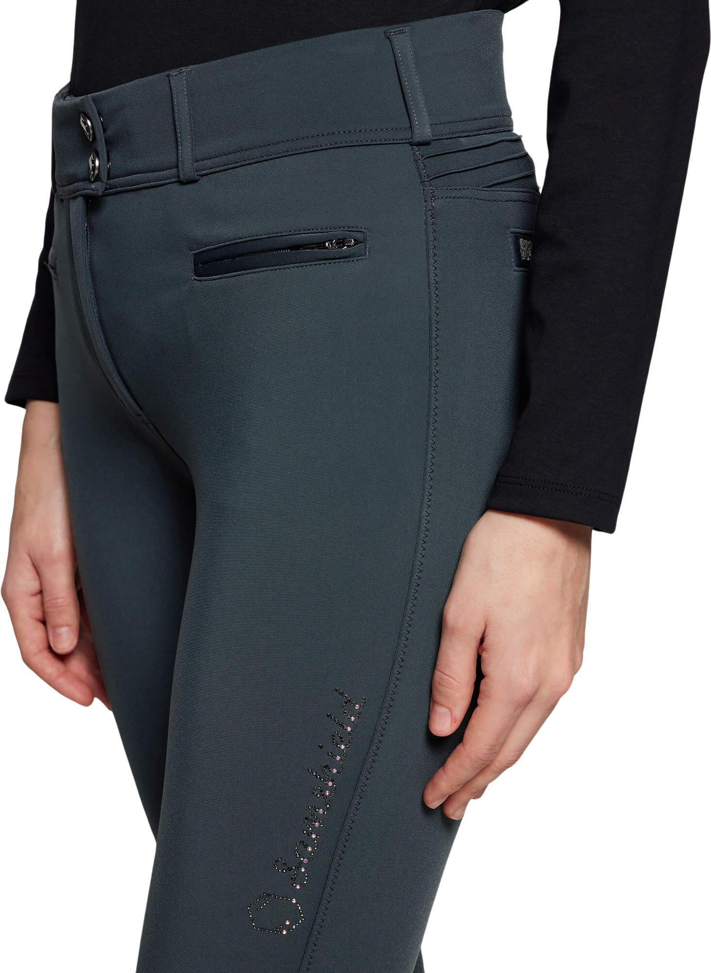 - Samshield-Logo aus Swarovski-Kristallen auf dem Oberschenkel und Crystal Fabric-Verzierungen auf den Gesäßtaschen