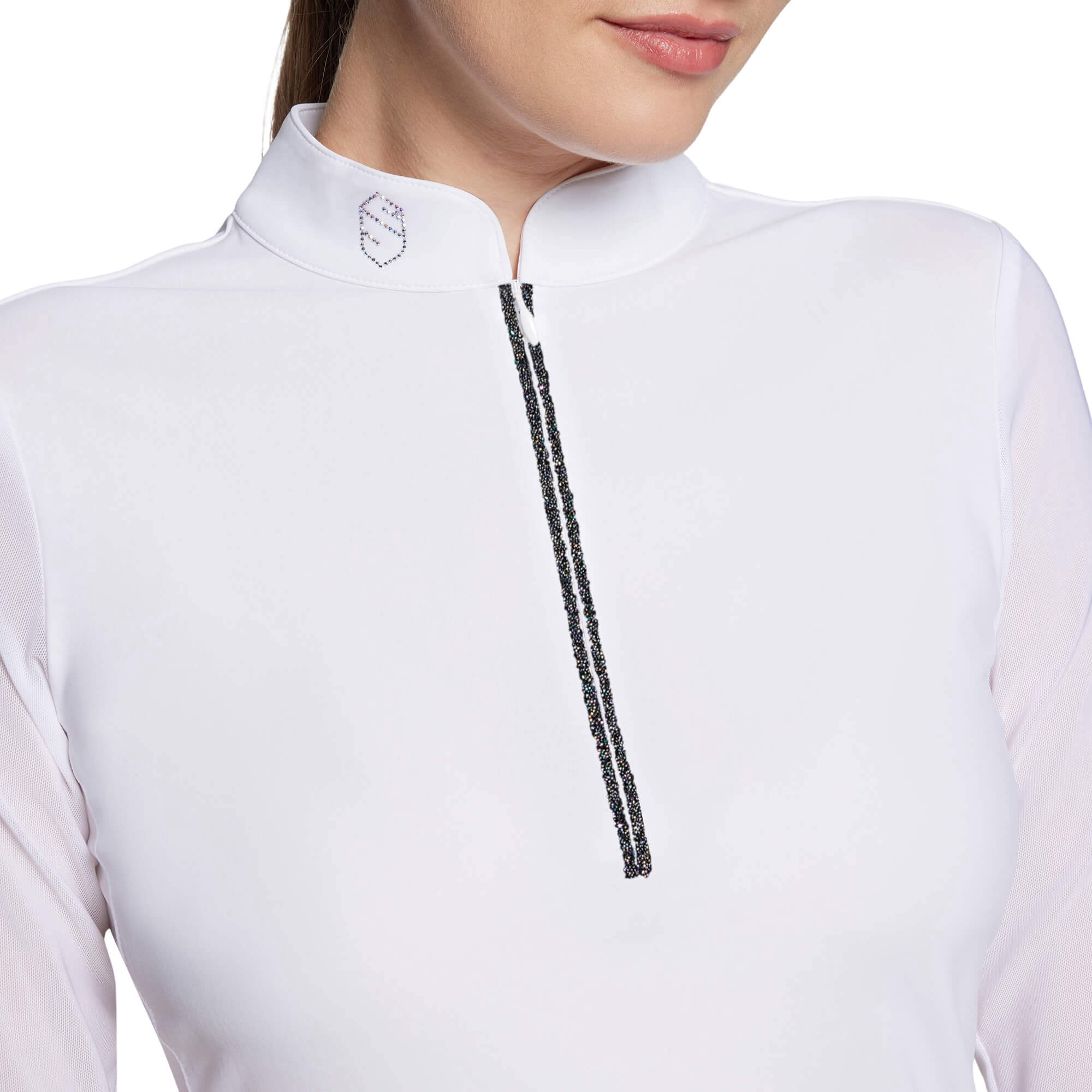 - Samshield-Logo mit Swarovskisteinen am Kragen